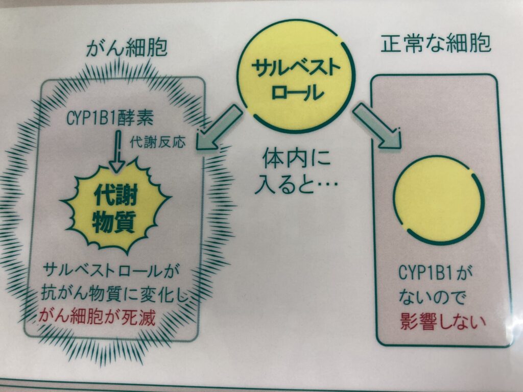 動物や人間がサルベストロールを服用すると、がん細胞が持つ特有の酵素CYP1B1と反応して抗がん物質となりがん細胞を死滅させます。