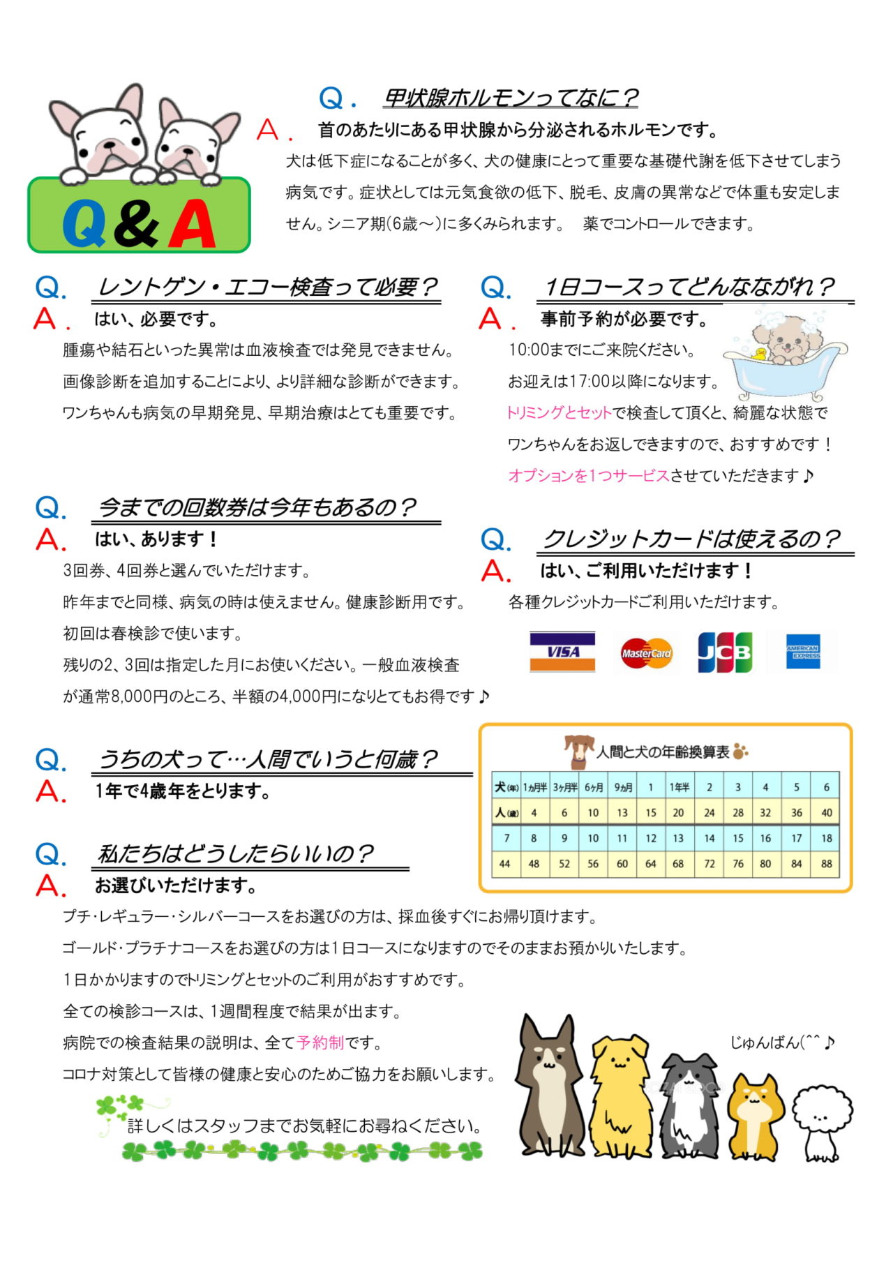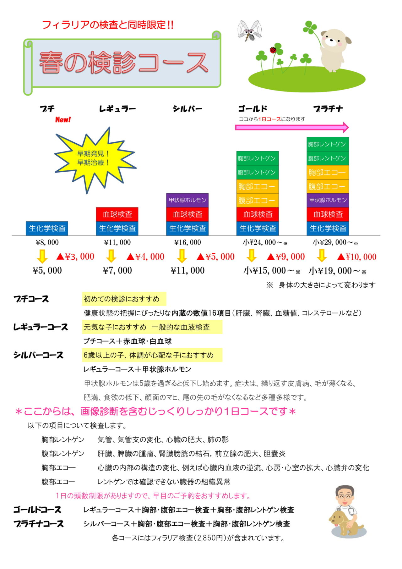 当院では、フィラリアの予防に向けた検査とレントゲン・胸部・腹部エコー・甲状腺ホルモンの検診をセットにしたコース診療を行っております。